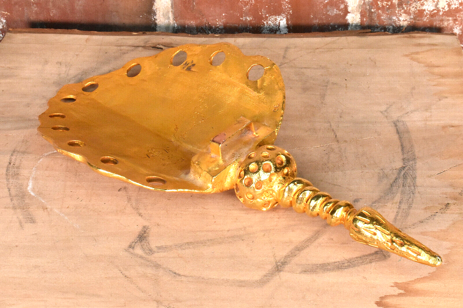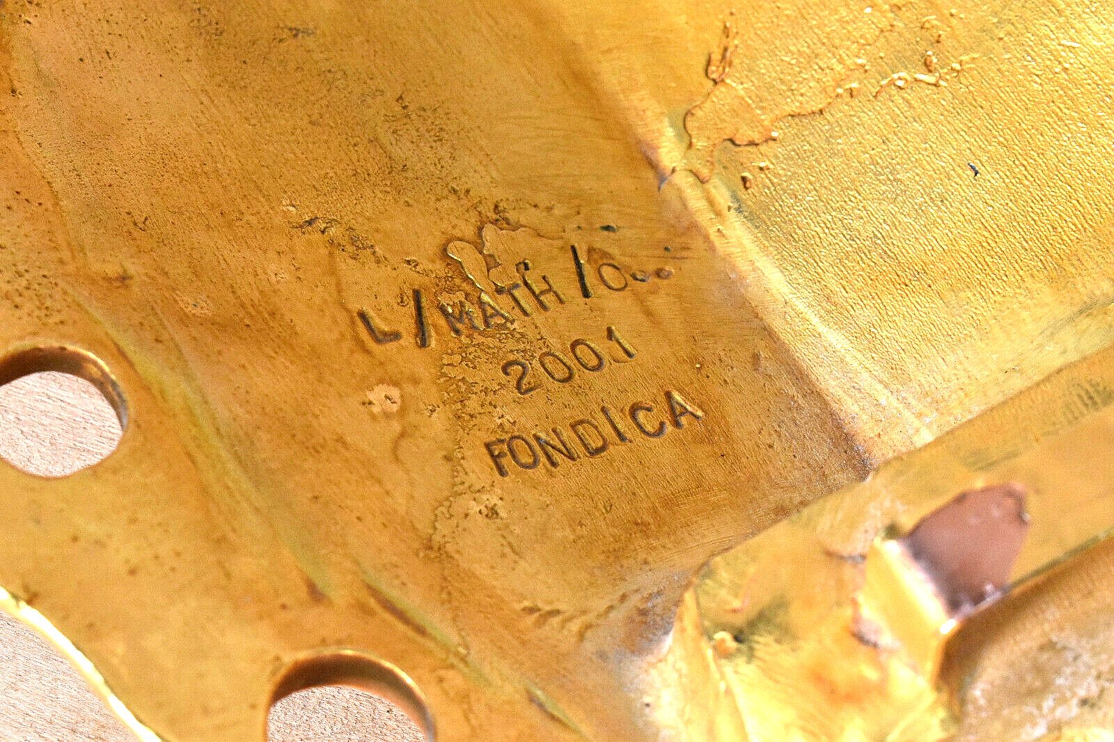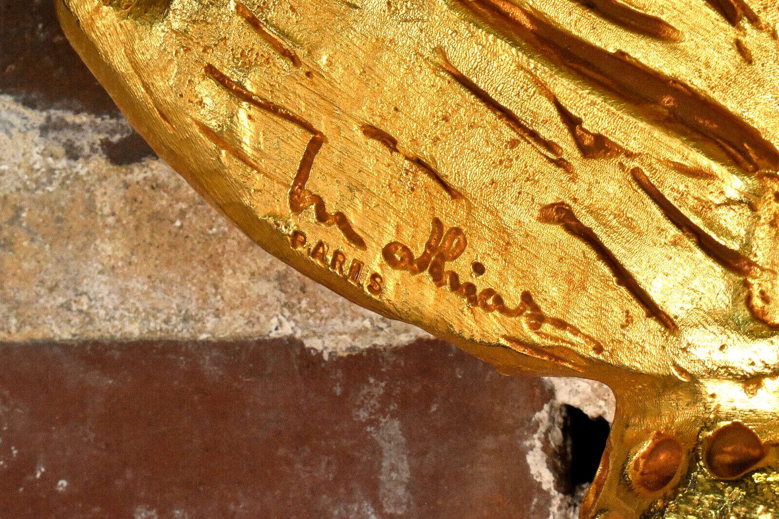 This pair of Gold Gilded Wall Mounted Sconces by Mathias for Fondica, France, is in great condition. It is unknown if they have been used, but they show very minor wear, most likely due to age.