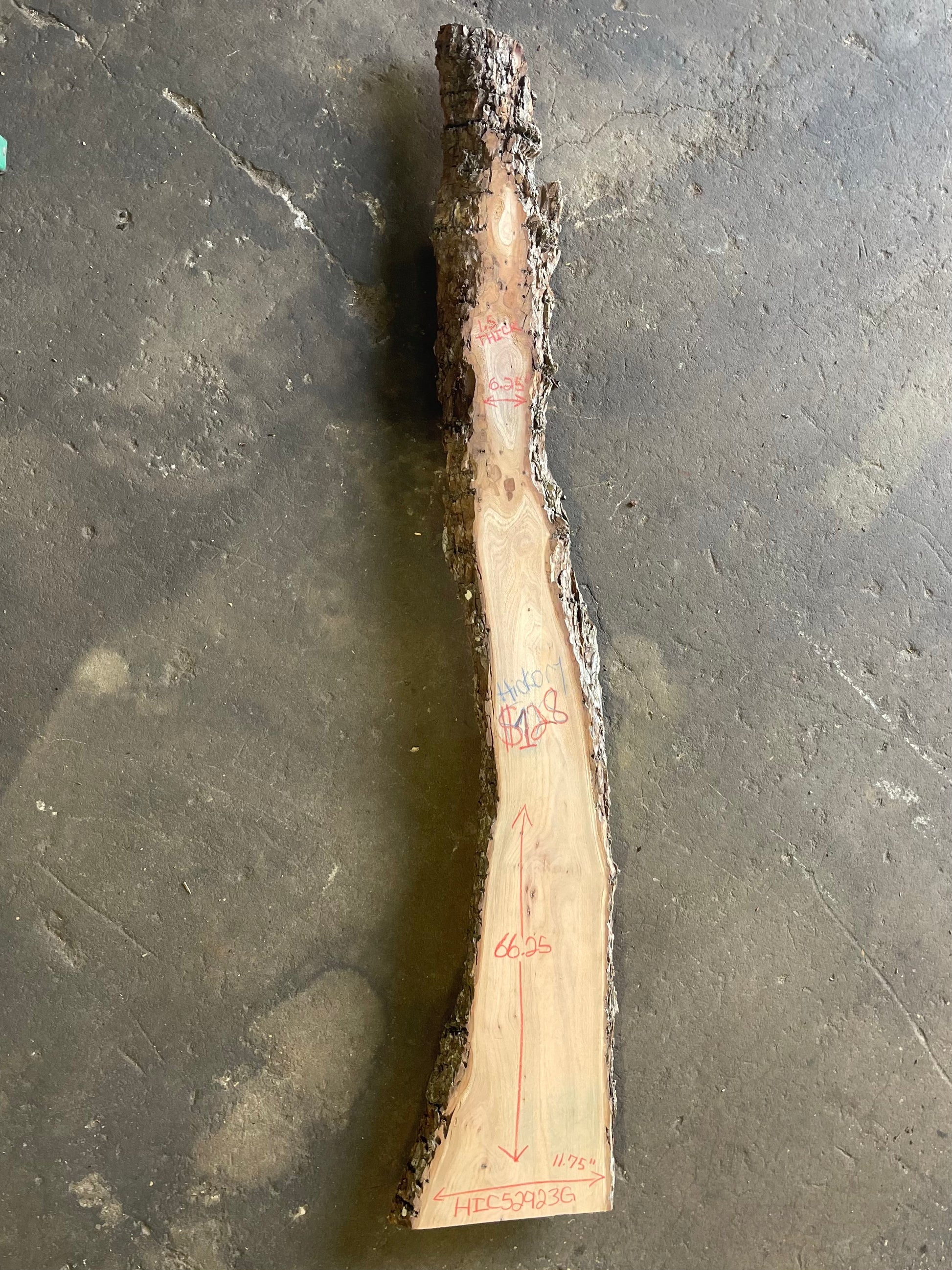 This Hickory Live Edge Slab measures 66.25" long by 11.75" at its widest point and is 1.5" thick. Dried in our iDry Kiln and surfaced by Eco Relics.