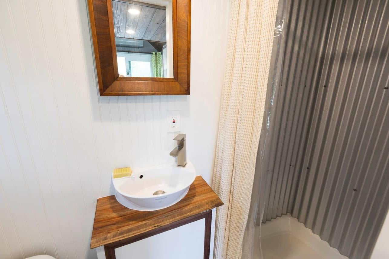 198 sq ft including one bathroom, loft bedroom. NOAH certified. LEED Certified Platinum. Build with 90% reclaimed materials including beautiful reclaimed maple gym flooring and reclaimed pine flooring on the ceilings. On-Demand Propane water heater. Solar Panels. All plumbing is WaterSense certified including the RV toilet. Equipped with an EnergyStar apartment size refrigerator. Panasonic In-take/Out-take fan in kitchen to provide great air flow throughout. Mini-Split Unit. Full size kitchen sink. All exterior piping insulated with R5 wrap.